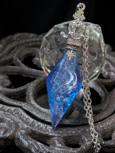 月の魔法使いの杖かんざし 夜空を旅する月の魔法使いが、そっと置いていったような神秘的なかんざしです。 あなたの髪を飾る魔法のステッキとして、ドールの特別な小物として…お使いいただけます。 深い青色と煌めくゴールド、2つの異なる魔法の力を宿したデザインをご用意しました。 クリアなレジンに閉じ込めた繊細な模様や、まるで本物の鉱石のような輝きは、職人が一つひとつ丁寧に作り上げた証。 月のチャームや星、そして羽が、あなたの夢をそっと後押ししてくれます。