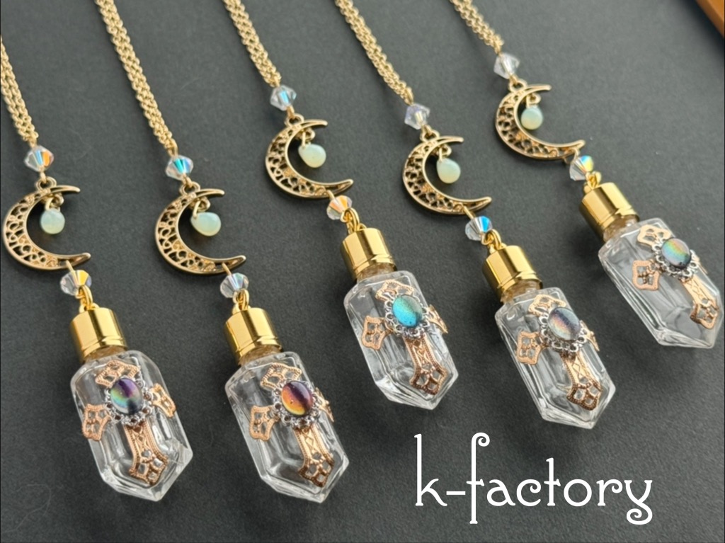 | 紹介文 | 胸元に香りを纏う、小さな魔法。 「パルファム・アミュレット」は、香水瓶の形をした繊細で美しいネックレスです。 お気に入りの香水やアロマオイルを数滴入れて、あなただけの香りをいつでもそばに。 まるで“香りのお守り”のようなアクセサリーです。 ガラスのきらめきと小さいながらも存在感のあるカボション 十字架のメタルパーツの繊細な装飾、 月のパーツに揺れるのはUVライトで光るチェコビーズ。 シンプルなコーディネートにも上品なアクセントを添えます。 自分へのご褒美にはもちろん、大切な方へのプレゼントにもおすすめです。 |