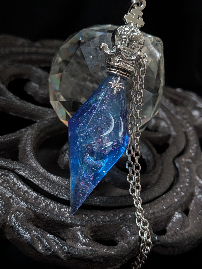 | 紹介文 | 月夜を閉じ込めたペンデュラム 小さな月の魔法が宿る魔法道具を貴方に。 月を閉じ込めたペンデュラムの形のネックレスです。 |