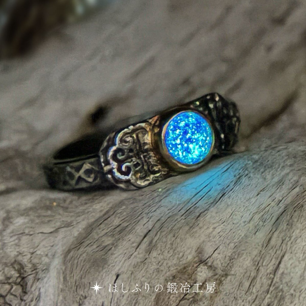 | 紹介文 | 精霊アストラの魔力を宿す指輪。 古代の知恵と魔法をその身に宿すために鍛えられた。 星降りの儀式の中で造られ、 指輪の中心には「精霊石」が据えられている。 ー<精霊石とは>ーー 装備に星の加護を付与するために使用される特別な石。古くから精霊アストラの魔力を宿す媒介として扱われてきた。 闇が深まるほどに内に宿した魔力が顕現し、ぼんやりと青白く発光する不思議な性質がある。 目に見える力よりも、魔法や霊性を重んじてきたこの国では、精霊石は貴重で重要な存在であった。 ーーーーーーーーーー 精霊石の周囲は黄金色の真鍮が華やかに縁取っている。 鍛え上げられた直後の指輪は、銀の表面が黒く沈み、古代遺物のような哀愁をまとう。 だが、日々の着用に伴う摩擦で少しずつ目を覚まし、銀本来の重厚な輝きを取り戻していく。 時間とともに姿を変え、身につける者の生活に馴染みながら、この指輪は静かに完成へと向かう。 精霊アストラよ。どうかこの者をお守りください。 ※この商品説明には一部フィクションを含みます。 <仕様> 金属部分(本体):シルバー950(銀の含有率が95%と高純度の銀合金) 金属部分(石の周囲):真鍮(黄金色に輝くアンティークな風合いの銅合金) 精霊石:ガラスを主成分とする蓄光性の工芸品(鉛を使わず環境や人体にやさしく配慮されたガラス素材を使用 ほしふりの鍛冶工房サイトはこちら↓ https://hoshifuri.net/ |