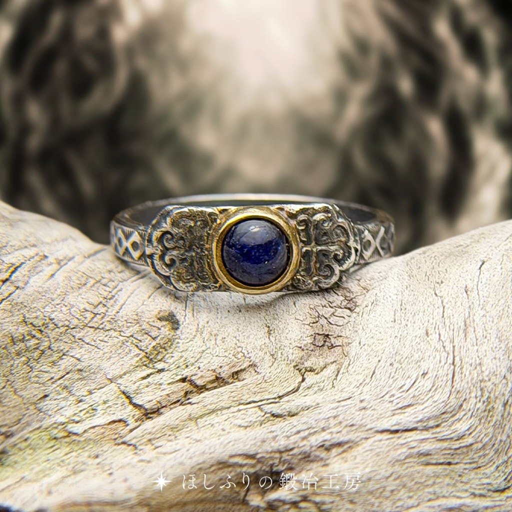 精霊アストラの魔力を宿す指輪。 旅立つ者の無事を祈りながら鍛えられた。 星降りの儀式の中で造られ、 指輪の中心には「精霊石」が据えられている。 ー<精霊石とは>ーー 装備に星の加護を付与するために使用される特別な石。古くから精霊アストラの魔力を宿す媒介として扱われてきた。 闇が深まるほどに内に宿した魔力が顕現し、ぼんやりと青白く発光する不思議な性質がある。 目に見える力よりも、魔法や霊性を重んじてきたこの国では、精霊石は貴重で重要な存在であった。 ーーーーーーーーーー 鍛え上げられた直後の指輪は、銀の表面が黒く沈み、古代遺物のような哀愁をまとう。 だが、日々の着用に伴う摩擦で少しずつ目を覚まし、銀本来の重厚な輝きを取り戻していく。 時間とともに姿を変え、身につける者の生活に馴染みながら、この指輪は静かに完成へと向かう。 精霊アストラよ。どうかこの者をお守りください。 ※この商品説明には一部フィクションを含みます。 <仕様> 金属部分:シルバー950(銀の含有率が95%の純度が高い銀合金) 精霊石:ガラスを主成分とする工芸品(鉛を使わず環境や人体にやさしく配慮されたガラス素材を使用) ほしふりの鍛冶工房サイトはこちら↓ https://hoshifuri.net/