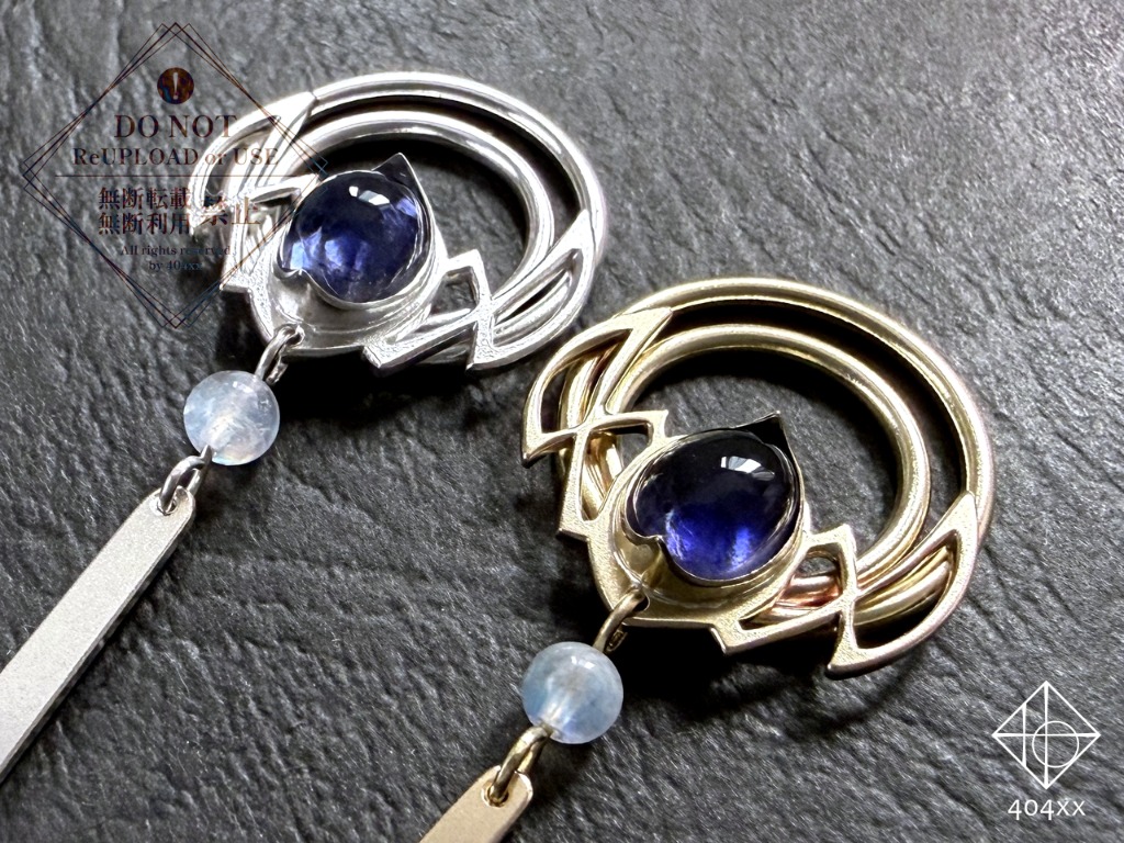 | 紹介文 | エルフや妖精などファンタジー世界の種族が着けていそうなイメージで制作した彫金細工の装飾品。 美しい鉱物の輝きを金属のつややかな曲線が引き立てる幻想的なアイテムです。 現在4/12(日)までの期間限定でwebショップにて受注中です! 今回は大変良質なアイオライトが主役です。 深く澄んだ青紫の色合いが美しく、魅惑的な雰囲気に仕上がっています。 地金は銀と真鍮の2種類、金具はネックレス、ピアス、イヤリングからお好きな仕立てを選べます。 |