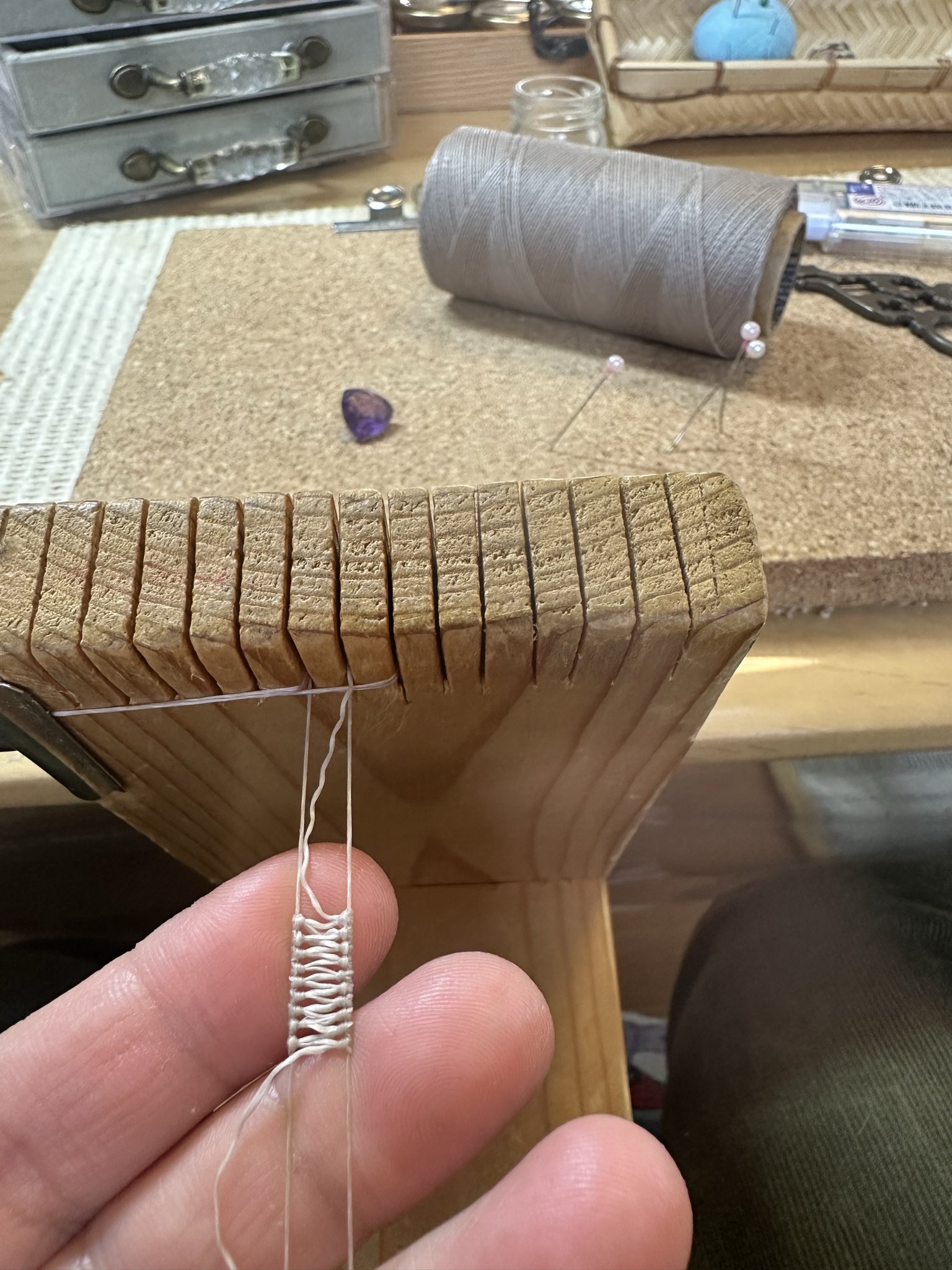マクラメは起源はハッキリとは分からないのですが、発祥が南米のほうらしくてですね。糸を使って模様を編んで装飾を作る技法のことをマクラメといって、その技法を使って作ったアクセサリーのことをマクラメアクセサリーと言います。