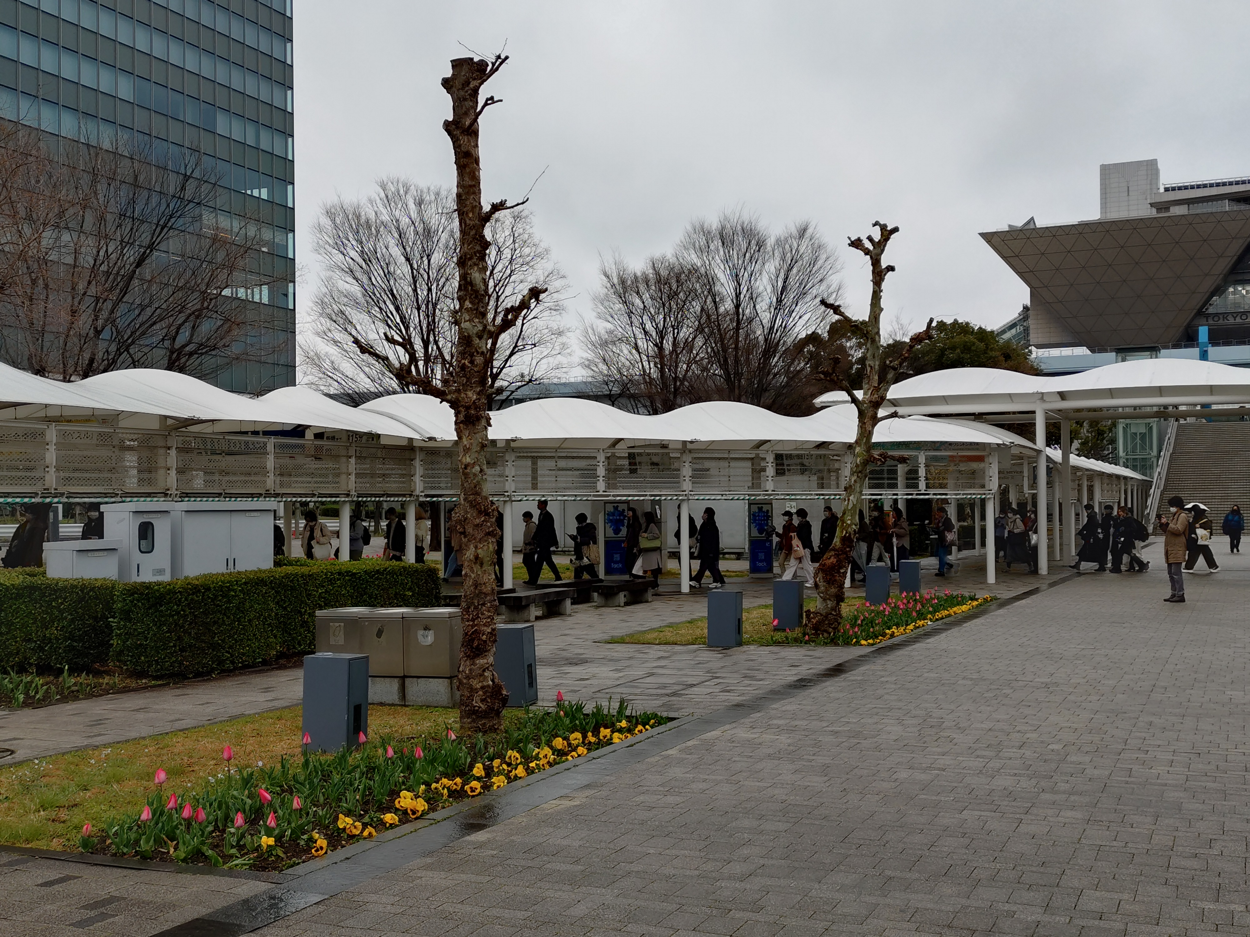 国際展示場からは屋根がある道が続いており、ある程度は濡れずに進むことができます。