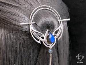 エルフや妖精などファンタジー世界の種族が着けていそうなイメージで制作した髪飾り。 大粒の天然石を使用し、石の形に合わせて1つ1つデザインを調整した一点物シリーズの作品です。 美しい鉱物の輝きを金属のつややかな曲線が引き立てる幻想的なアイテムです。 こちらは不定期に制作しており、販売する際の告知等はSNSにて行なっています。