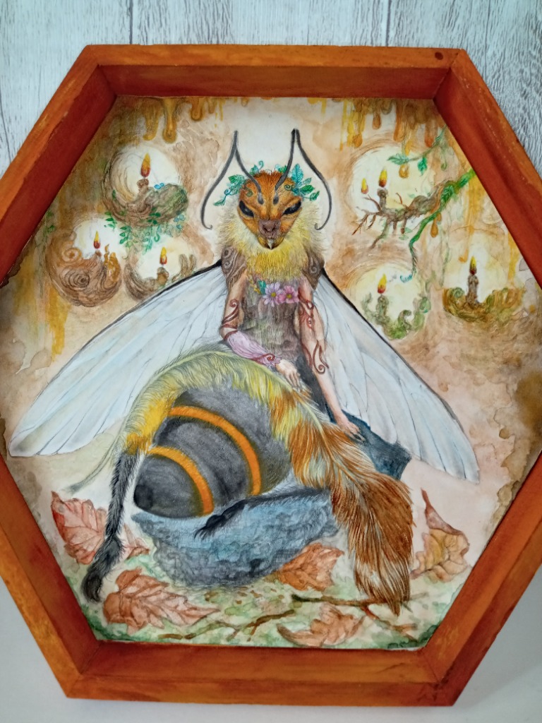 | 紹介文 | 六角形の木枠の中に、蜂の女王様の妖精を納めました。 働き蜂達から奉納されたハーピーの羽をひざ掛けにして 寛いでいます…。 素材:木、ケント紙、水彩絵の具、鉛筆 2019年 制作 |