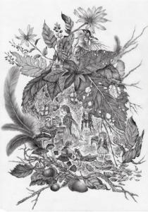 " 遠くのあなたへ お元気ですか? ずいぶん寒くなりましたね・・・。 私達は冬の備えをしています。 春には また お会いしましょうね・・・・・・ " 秋の妖精たちの親子をイメージして鉛筆のみで描きました。 父親の帰りを待つ、枯れ葉や枝の家に棲む妖精の母子の様子。 ■使用した画材等についての説明は以下に箇条書きにて記載させていただきました。 画材:鉛筆 紙:イラストボード サイズ:A4(210 mm x 297 mm 厚さ 2mm)