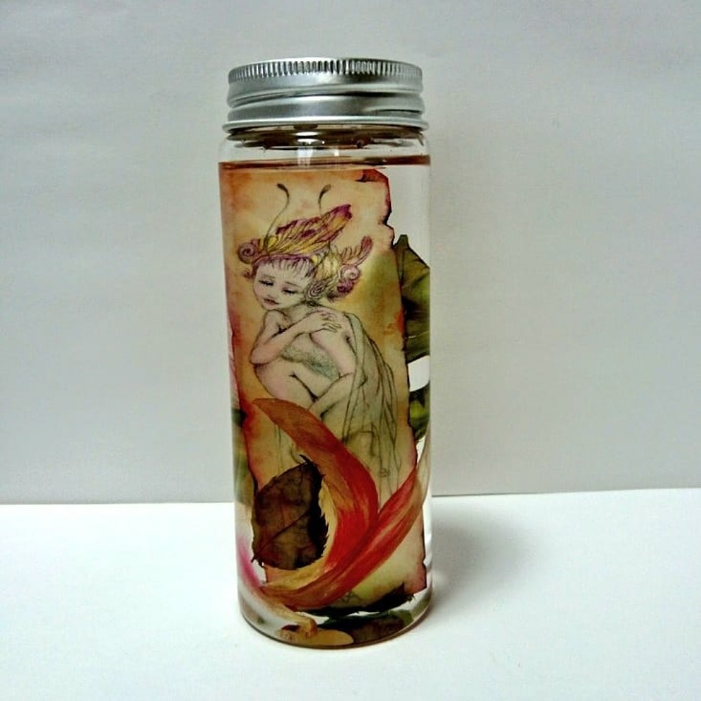 | 紹介文 | 生花の花びらと花の妖精。 初めて作ったハーバリウム第一弾でした。 手書きの原画とドライフラワーを閉じ込めた、オリジナルのハーバリウムです。 様々な角度や、光の当たり具合などで、見え方をお楽しみいただくことができます。 ※ハーバリウムとは、植物標本の事です。 インテリア用の装飾性の高いガラス瓶や密閉容器などに、 シリコンオイルやハーバリウムオイル(流動パラフィン)などを用いて、鑑賞目的として制作された植物標本などもハーバリウムと呼ばれています。 素材:流動パラフィン、ガラス小瓶、ドライフラワー、イラスト原画1枚 サイズ:高さ 12.2cm × 幅 4.3cm ×奥行 4.3cm |