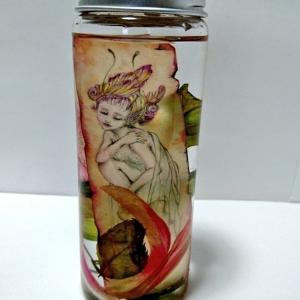 生花の花びらと花の妖精。 初めて作ったハーバリウム第一弾でした。 手書きの原画とドライフラワーを閉じ込めた、オリジナルのハーバリウムです。 様々な角度や、光の当たり具合などで、見え方をお楽しみいただくことができます。 ※ハーバリウムとは、植物標本の事です。 インテリア用の装飾性の高いガラス瓶や密閉容器などに、 シリコンオイルやハーバリウムオイル(流動パラフィン)などを用いて、鑑賞目的として制作された植物標本などもハーバリウムと呼ばれています。 素材:流動パラフィン、ガラス小瓶、ドライフラワー、イラスト原画1枚 サイズ:高さ 12.2cm × 幅 4.3cm ×奥行 4.3cm