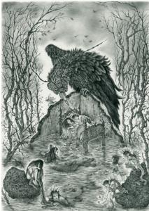 巨大な怪鳥は 人魚と少年の恋人たちの眠りと夢を守っています… 孤独な怪鳥よ。 朽ちゆく二人の棲み処を護れ。 水底潜む夢を見守れ。 鳥と魚の夢の果て。 素材:鉛筆、ケントボード サイズ:A3
