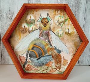 六角形の木枠の中に、蜂の女王様の妖精を納めました。 働き蜂達から奉納されたハーピーの羽をひざ掛けにして 寛いでいます…。 素材:木、ケント紙、水彩絵の具、鉛筆 2019年 制作
