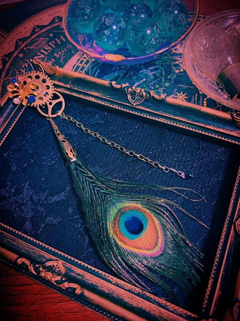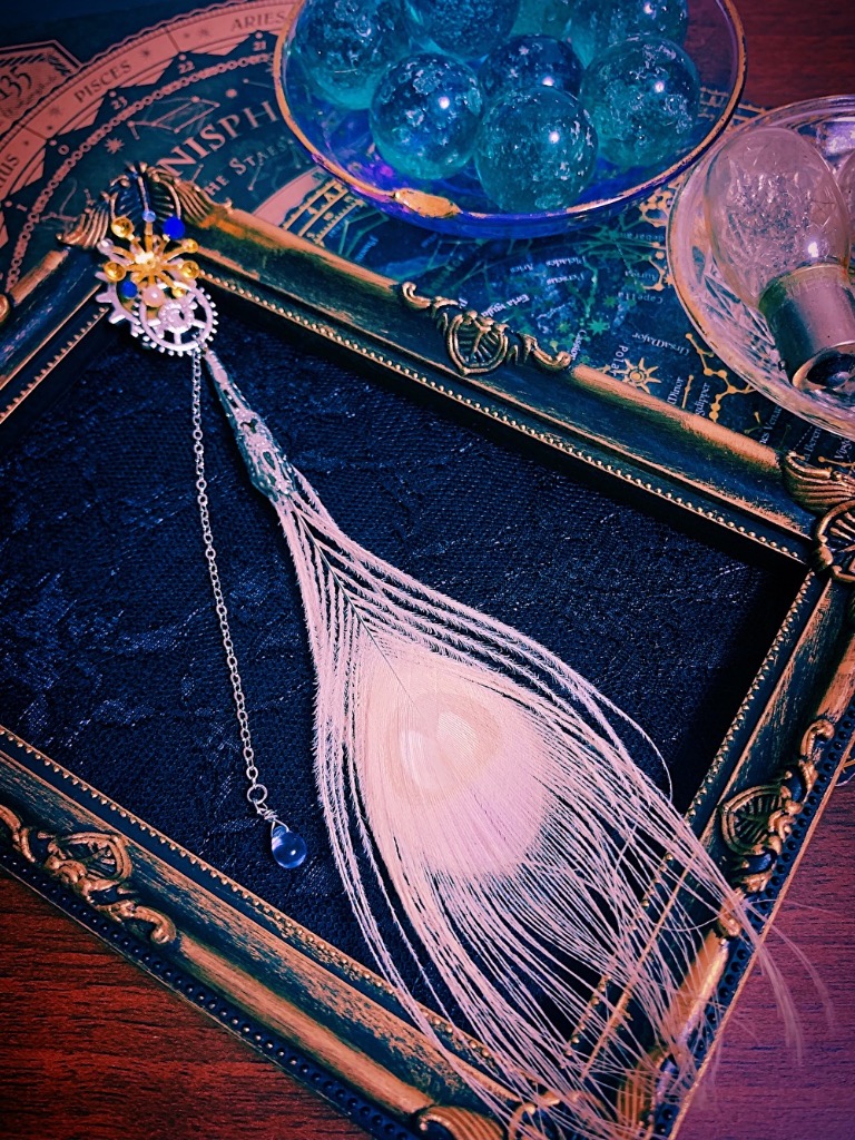 | 紹介文 | これを身に付けていれば孔雀の声(断末魔)を聞くことが出来る__。 そう聞いたのはもう何年も昔の事。 未だに孔雀の羽撃く音さえ聞いたことは無い。 目の前の深い湖に沢山沈んでいるというのに___。 .*・゚ .゚・*..*・゚ .゚・*..*・゚ .゚・*..*・゚ .゚・*..*・゚ .゚・*..*・゚ .゚・*. 孔雀の羽が付いたイヤークリップ(片耳用)です。耳の後ろでパチンと挟んでつける形になります。 服の襟元などにブローチとしても使って頂けます。  |