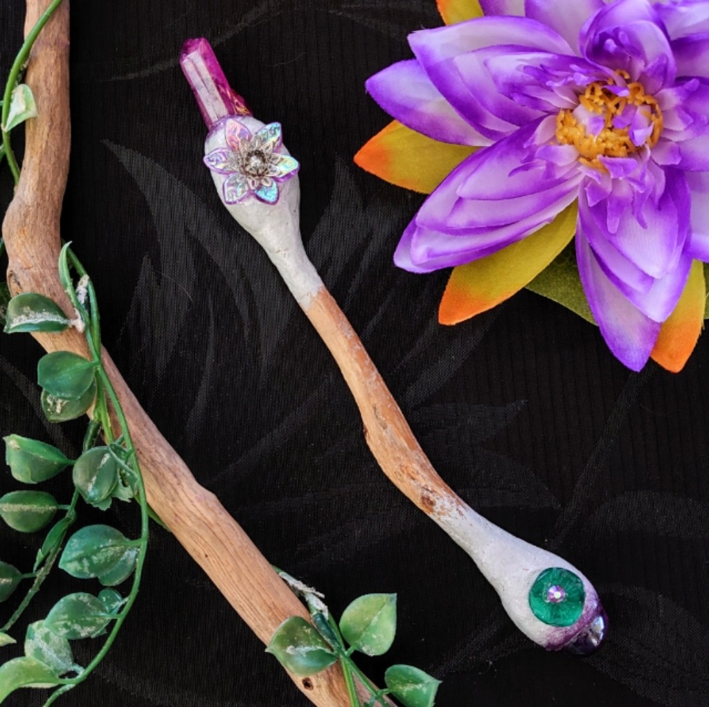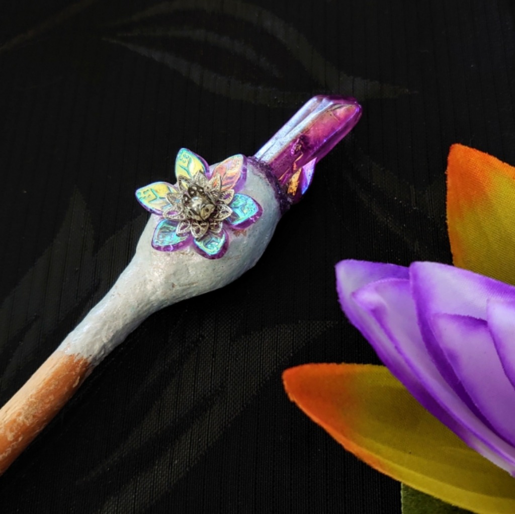 | 紹介文 | 古来より神聖な花とされる蓮のワンドです。 ポイント部分には蓮の花、スフィア部分には蓮の葉の装飾を施しました。 ホルダーには味わいのあるフォルムの流木を選びました。 こちらは神秘的なマゼンタカラーになります。  |