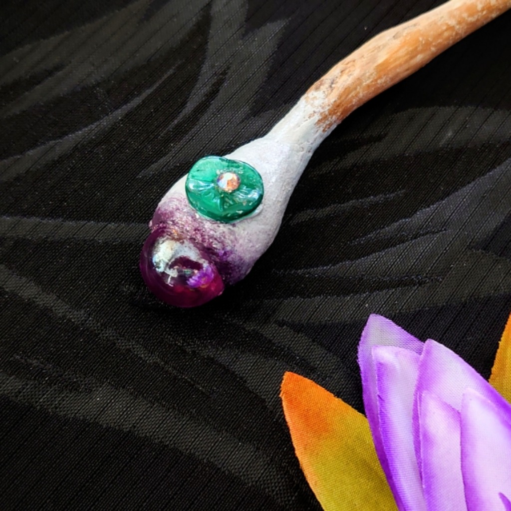 まだ夜が明けやらぬ時間。 うっすらと白んでくる空に残る細い月に、清らかな祈りを捧げる魔女をイメージしました。 ポイントのマゼンタ~パープルのグラデーションが美しいワンドです。
