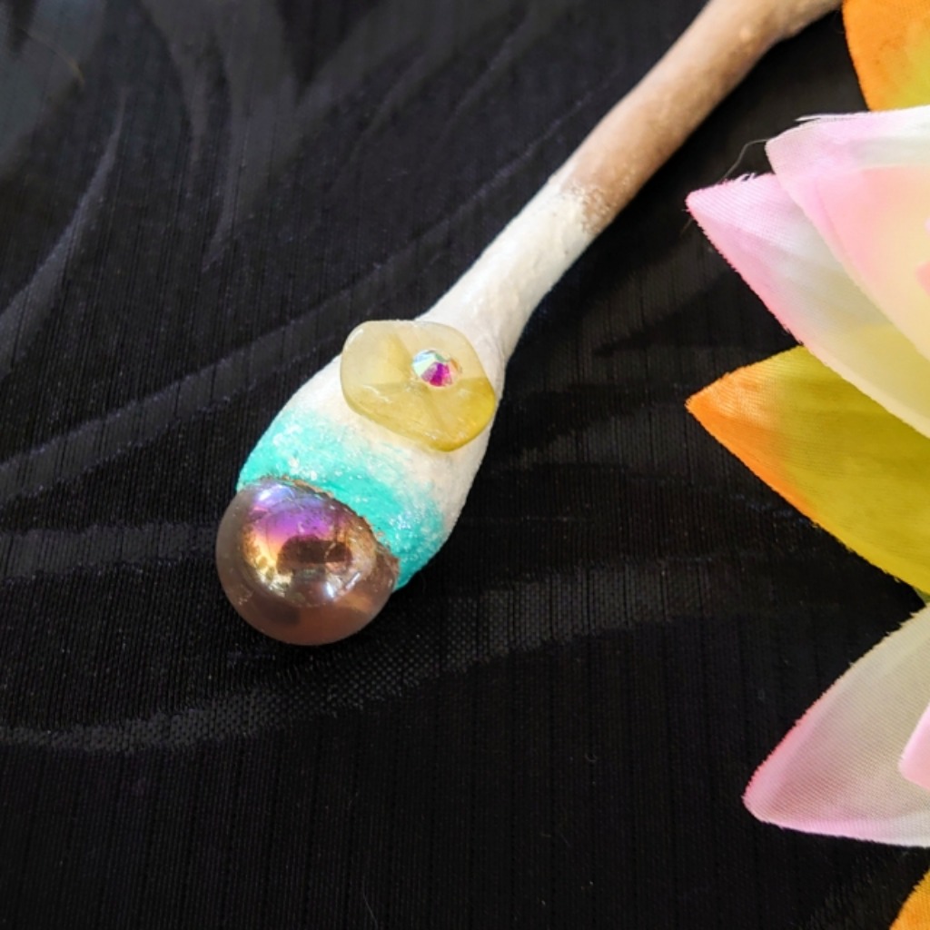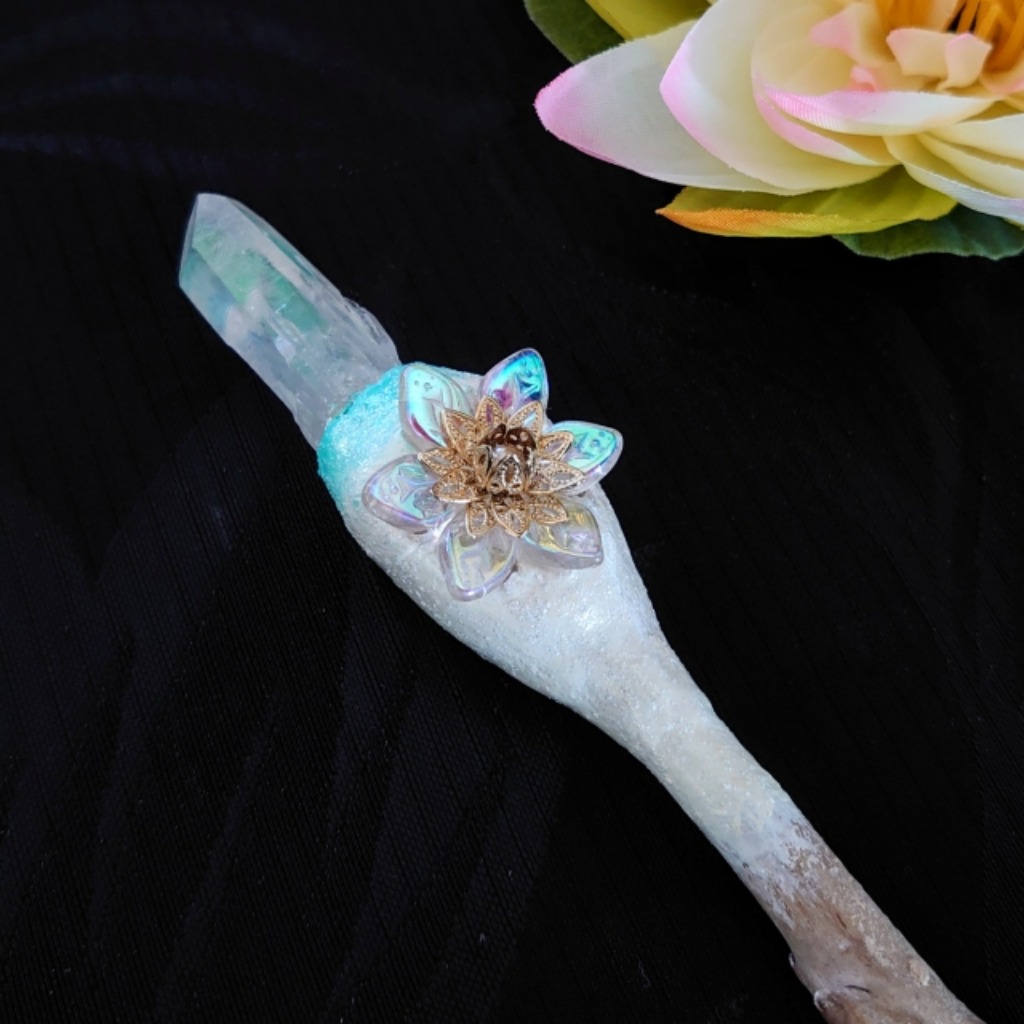 海の宝で飾りたてられた、お伽噺の絵本のような人魚姫のワンドです。 ポイントのオーシャンオーラのブルー~グリーンのグラデーションが、爽やかで美しいワンドです。