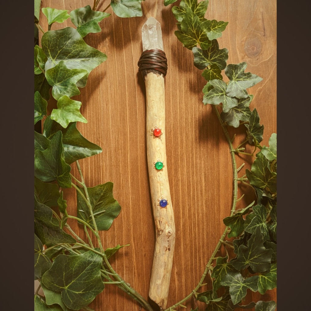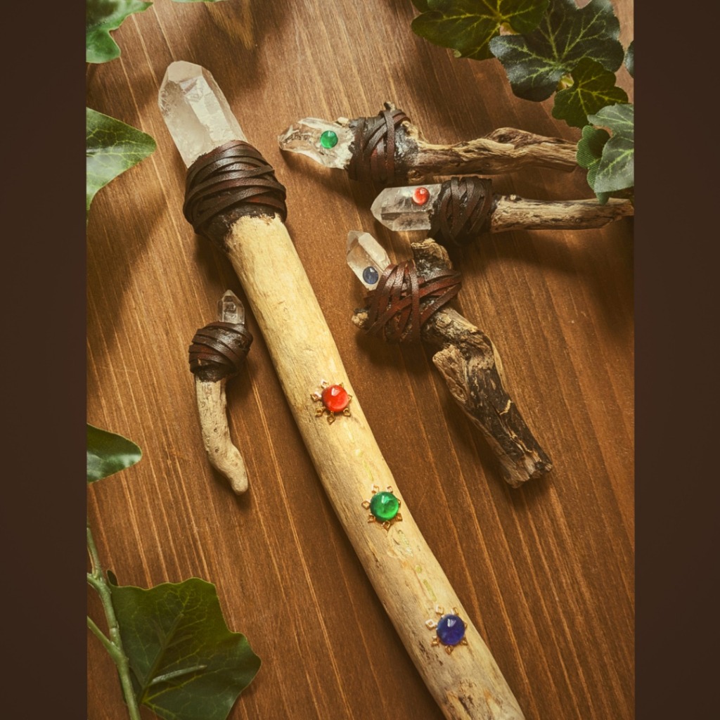 | 紹介文 | 昔、本でヒーリング用に使うクリスタルワンドというものを見て、それからものづくりを始めた初期の頃からずっと作りたくても技術不足で作れなかった作品を、ついに形にする事が出来ました。 至ってシンプルな木と鉱石のケルティックな杖ですが、素材は自然の物を使っております。  |