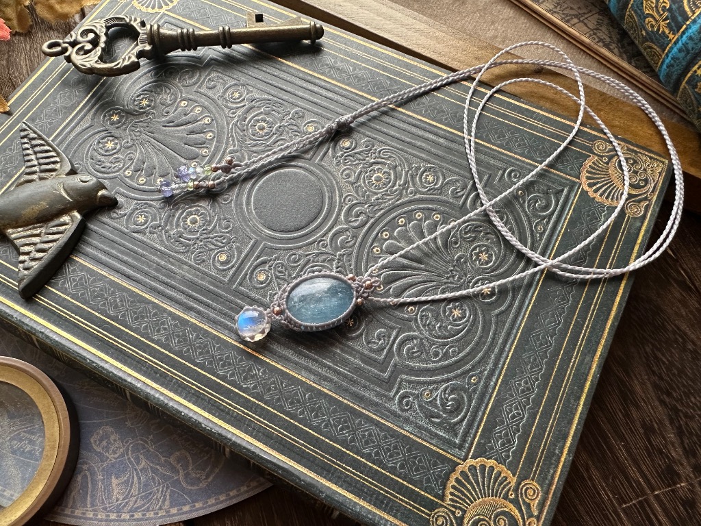言祝ぎの音が八千代に広がるような、夜をすべる日ノ本の神である月夜見尊の祝福を受けた首飾り。 宵闇に濡れる鴉の羽根色の飾り緒が舞うたびに広がれば、夜中の静謐さと神聖さの中に静かなる夜と月の神の神力が広がります。 装着におけるスキル付与・属性値は以下の通りです。 ≪スキル付与・属性値≫ 月属性(和)+15 夜属性 ×0.8% 青属性 +9 幸運値 +25 敵避効果 ランダム測定×0.25%+固有値 スピードアップ 優雅≠0.2%×固有値 おしゃれ度 0.25%×固有値 安眠効果 踊り効果 謳い効果 現実逃避効果 装備制限:特になし 但し、下記職の特殊装備品であるため、各職の仕事率が1.5倍なんかしらUP。 特殊装備品対応職:和職(職人)、絵描き、創作師、歌手、舞手、踊手、巫女・神職、祓人、吟遊詩人、魔女・魔術師・魔法使い・魔導士 装着護符としての効力はもちろん、保管箱の中にお入れいただいていてもその神力に包まれるため、安眠効果などが付与されます。ジョブが吟遊詩人や舞職、祓い人、召喚士様におすすめの珍しい占有装備品となります。 (※現代日本で紹介されているパワーストーン的なものとは一切関係ございません。この作品はフィクションです。実在の効果効能を保証するものではありません。) ーーーーーーーーーーーーーーーーーーー ≪作品紹介≫ トップは扇形の珍しい形状のレインボームーンストーン(ホワイトラブラドライト)です。やや透明感があり、ブルーの落ち着いたシラーが角度によってご覧いただけるルースです。その下には満月のようなやや強めのシラーを持つレインボームーンストーン。一番下には、雫型の落ち着いた色合いのタンザナイトを組み合わせました。 扇形は末に広がる縁起の良い形状として、古来より日本では愛されてきた形状です。扇に巻かれた飾り緒や珠玉の意匠が幼い頃より大好きで、巫女舞の時に見られる扇や飾り緒の艶やかさを思い浮かべながらデザインを決めております。 夕の暮れから宵の明けまで夜を支配する日本の神様の一柱である月読尊からインスピレーションを受け、製作した首飾りです。夜の始まりを知らせる、日本神話では神聖視されている鴉が羽音で夜の始まりを知らせ、扇で舞い踊りながら宵の宴を楽しむような様子をイメージしております。