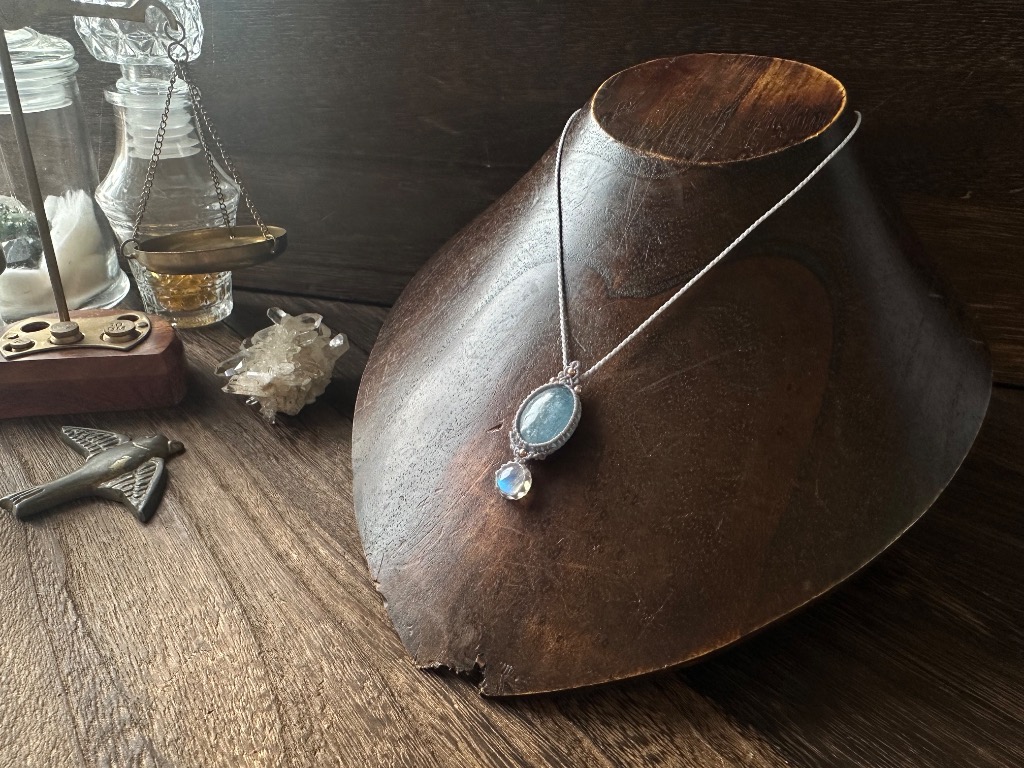 耳寄せると星の囁きが聞こえるという祈りの巫女の聖遺物。 その「音」を耳にした者は、遥か昔の失われた力を取り戻すことができるという。 不思議な力が宿る石に選ばれ、魔力を引き出すことができた人物にだけ、蒼い輝きを以て応じるという。 ーーーーーーーーーーーーーーーーー ホワイトラブラドライト(ブルームーンストーン/れいんぼーむーんすとーん)のペンダント