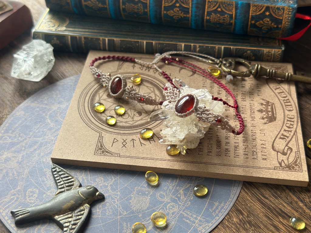 | 紹介文 | 炎の聖霊の加護が満ちた紅玉色の手首飾り。 あらゆる火焔を自在に操り、魔を焼き払う力を行使することができるという。 持ち主の力量と技術に応じて、操れる火焔が異なる。 「汝、焔の災禍に呑まれる事勿れ」とブレスレットと対になるペンダントの魔石に古代文字で刻まれている。 正しき心で、己の炎に向き合い行使する者にこそ、真なる力が解放されるという。 精緻に編まれた紋様は魔力を流す特殊な糸を使用しているとのこと。  |