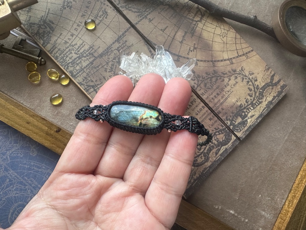 | 紹介文 | さぁさ、お立合い。 星詠みの魔女様の必需品。 自在に「星」を読み取る力を持つ、とっておきのブレスレットだ。 ~~~~~~~~ 星屑の魔石を7日7晩月光に当て、月明かりの光の下で月灯の道具で丁寧に研磨し整えられたひと粒。 魔力を帯びた特殊な糸で丁寧に編み込まれている。 角度によって移り変わるのは、望む未来を示す力を持つ星屑の魔石の魔力の揺らぎのなせる業。 ひとたび指先で触れれば、瞬く間に魔力が馴染み「私こその装身具」だと確信を持っていただけるはず。 ~~~~~~~~ 人それぞれの魔力の引き合いに応じて、望む者の前にのみブレスレットが現れるのだという。  |