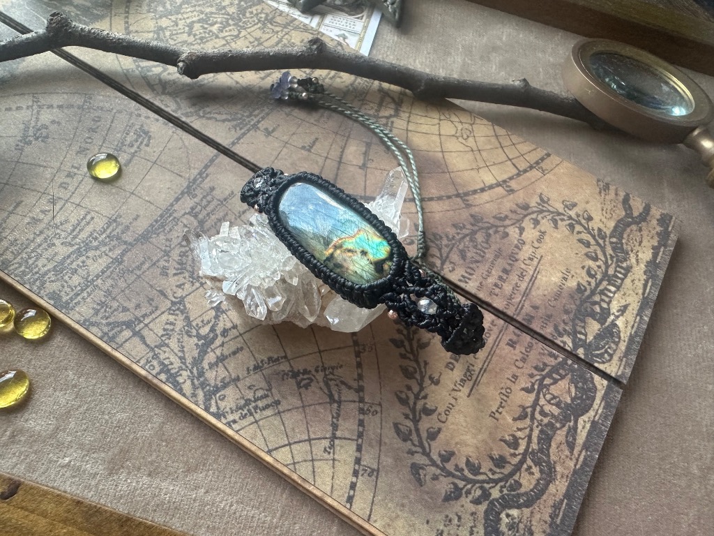 耳寄せると星の囁きが聞こえるという祈りの巫女の聖遺物。 その「音」を耳にした者は、遥か昔の失われた力を取り戻すことができるという。 不思議な力が宿る石に選ばれ、魔力を引き出すことができた人物にだけ、蒼い輝きを以て応じるという。 ーーーーーーーーーーーーーーーーー ホワイトラブラドライト(ブルームーンストーン/れいんぼーむーんすとーん)のペンダント