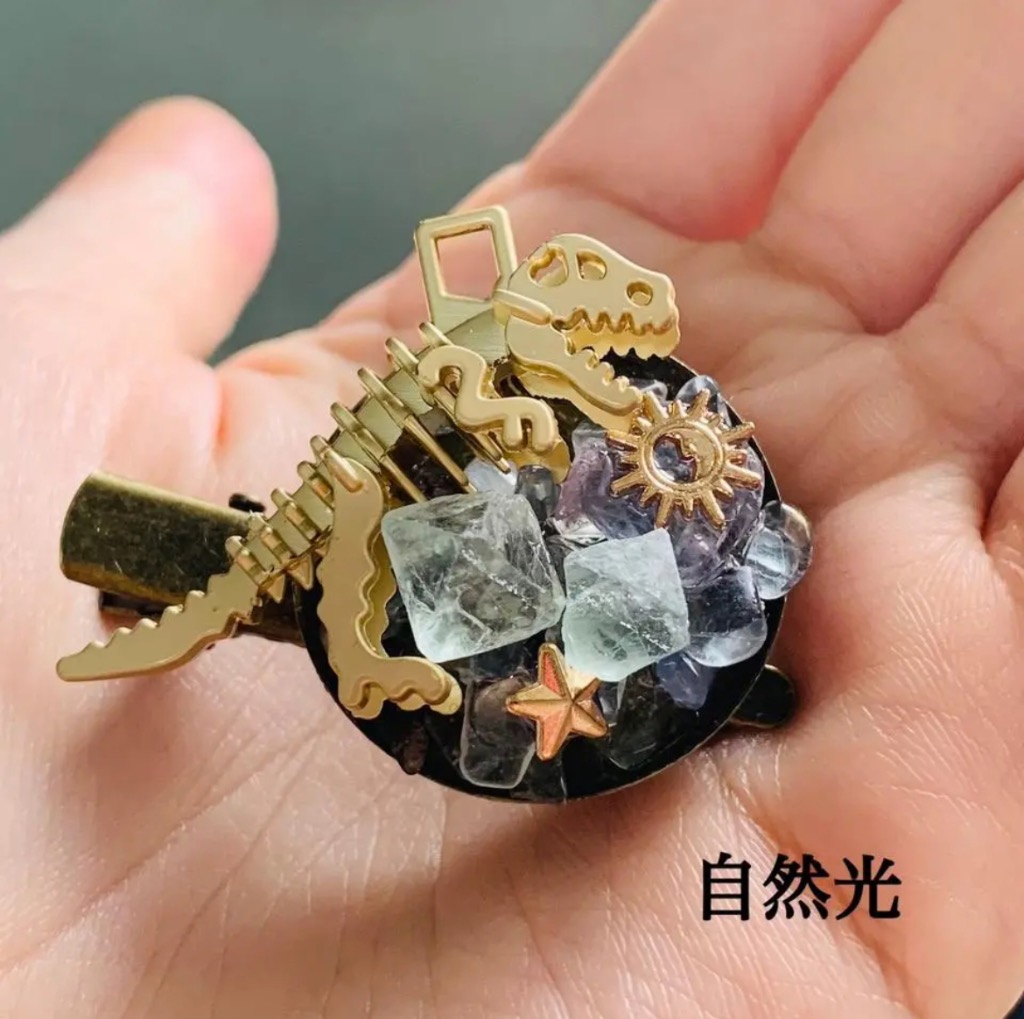 | 紹介文 | ───むかし むかし  よくばりな かいじゅう は さみしく よるを すごしていました しかし ともだちが いないので ただ じぶんのあつめた つめたい ほうせきを だきしめて ねむるのでした ゚*。:゚ .゚*。:゚ .゚*。:゚ .゚*。:゚ .゚*。:゚゚*。:゚ .゚*。:゚ .゚*。:゚ .゚ 恐竜が鉱石を抱えたブローチ&クリップです。 裏面にピンとクリップが付いているので、お好きな方で留めて頂けます。 服の襟元や、帽子、鞄など自由にアレンジしてお使いください。 石部分はフローライト(蛍石)を使用しています💎 ※石の配置や、恐竜以外の小さな金属パーツの配置は一つ一つ異なります。  |