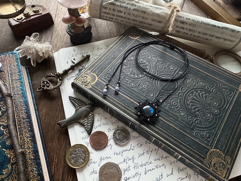 言祝ぎの音が八千代に広がるような、夜をすべる日ノ本の神である月夜見尊の祝福を受けた首飾り。 宵闇に濡れる鴉の羽根色の飾り緒が舞うたびに広がれば、夜中の静謐さと神聖さの中に静かなる夜と月の神の神力が広がります。 装着におけるスキル付与・属性値は以下の通りです。 ≪スキル付与・属性値≫ 月属性(和)+15 夜属性 ×0.8% 青属性 +9 幸運値 +25 敵避効果 ランダム測定×0.25%+固有値 スピードアップ 優雅≠0.2%×固有値 おしゃれ度 0.25%×固有値 安眠効果 踊り効果 謳い効果 現実逃避効果 装備制限:特になし 但し、下記職の特殊装備品であるため、各職の仕事率が1.5倍なんかしらUP。 特殊装備品対応職:和職(職人)、絵描き、創作師、歌手、舞手、踊手、巫女・神職、祓人、吟遊詩人、魔女・魔術師・魔法使い・魔導士 装着護符としての効力はもちろん、保管箱の中にお入れいただいていてもその神力に包まれるため、安眠効果などが付与されます。ジョブが吟遊詩人や舞職、祓い人、召喚士様におすすめの珍しい占有装備品となります。 (※現代日本で紹介されているパワーストーン的なものとは一切関係ございません。この作品はフィクションです。実在の効果効能を保証するものではありません。) ーーーーーーーーーーーーーーーーーーー ≪作品紹介≫ トップは扇形の珍しい形状のレインボームーンストーン(ホワイトラブラドライト)です。やや透明感があり、ブルーの落ち着いたシラーが角度によってご覧いただけるルースです。その下には満月のようなやや強めのシラーを持つレインボームーンストーン。一番下には、雫型の落ち着いた色合いのタンザナイトを組み合わせました。 扇形は末に広がる縁起の良い形状として、古来より日本では愛されてきた形状です。扇に巻かれた飾り緒や珠玉の意匠が幼い頃より大好きで、巫女舞の時に見られる扇や飾り緒の艶やかさを思い浮かべながらデザインを決めております。 夕の暮れから宵の明けまで夜を支配する日本の神様の一柱である月読尊からインスピレーションを受け、製作した首飾りです。夜の始まりを知らせる、日本神話では神聖視されている鴉が羽音で夜の始まりを知らせ、扇で舞い踊りながら宵の宴を楽しむような様子をイメージしております。