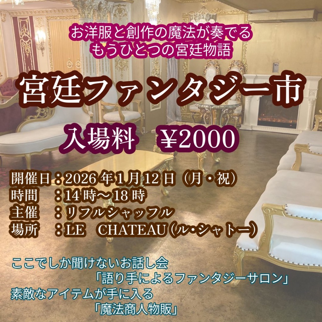 | 紹介文 | お洋服と創作の魔法が奏でる もう一つの宮廷物語 「宮廷ファンタジー市」 開催日 :2026年 1月12日(月・祝) 開催時間 :14時~18時 主催 :リフルシャッフル 一般入場料 :2000円 参加条件 :フリルの付いた服 or 礼服 場所 :LE CHATEAU LE CHATEAU(ル・シャトー) 東京都新宿区四谷坂町12-12-B1 都営新宿線「曙橋駅」A4出口より徒歩4分 (出口を右折し直進4分右側) 宮廷ファンタジー市は ファンタジーゲームに出てくるお城をテーマにした交流メインのサロンイベントです。 特別な【トキ】と【モノ】を探して彷徨う「フリル服が大好きなレディ」と、 世界に一つしかない魔法アイテムを創る「魔法商人」が出会う運命の日。 社交デビューがまだの駆け出し紳士淑女様 かわいい服を買ったけどなかなか着る勇気が出なかった女の子 作品をお披露目したい魔法商人様。 自分が生み出した最高の作品を沢山の人に見てもらいたいクリエイター様 宮廷ファンタジー市は、そんな「毎日を頑張る」皆様へ特別体験を提供します。 この機会に是非お集まりください。 只今出展者募集中! 締め切りは 2026年1月5日 詳細は公式サイトをチェックです☆彡 ご来場、ご参加、お待ちしております(^_-)-☆ |