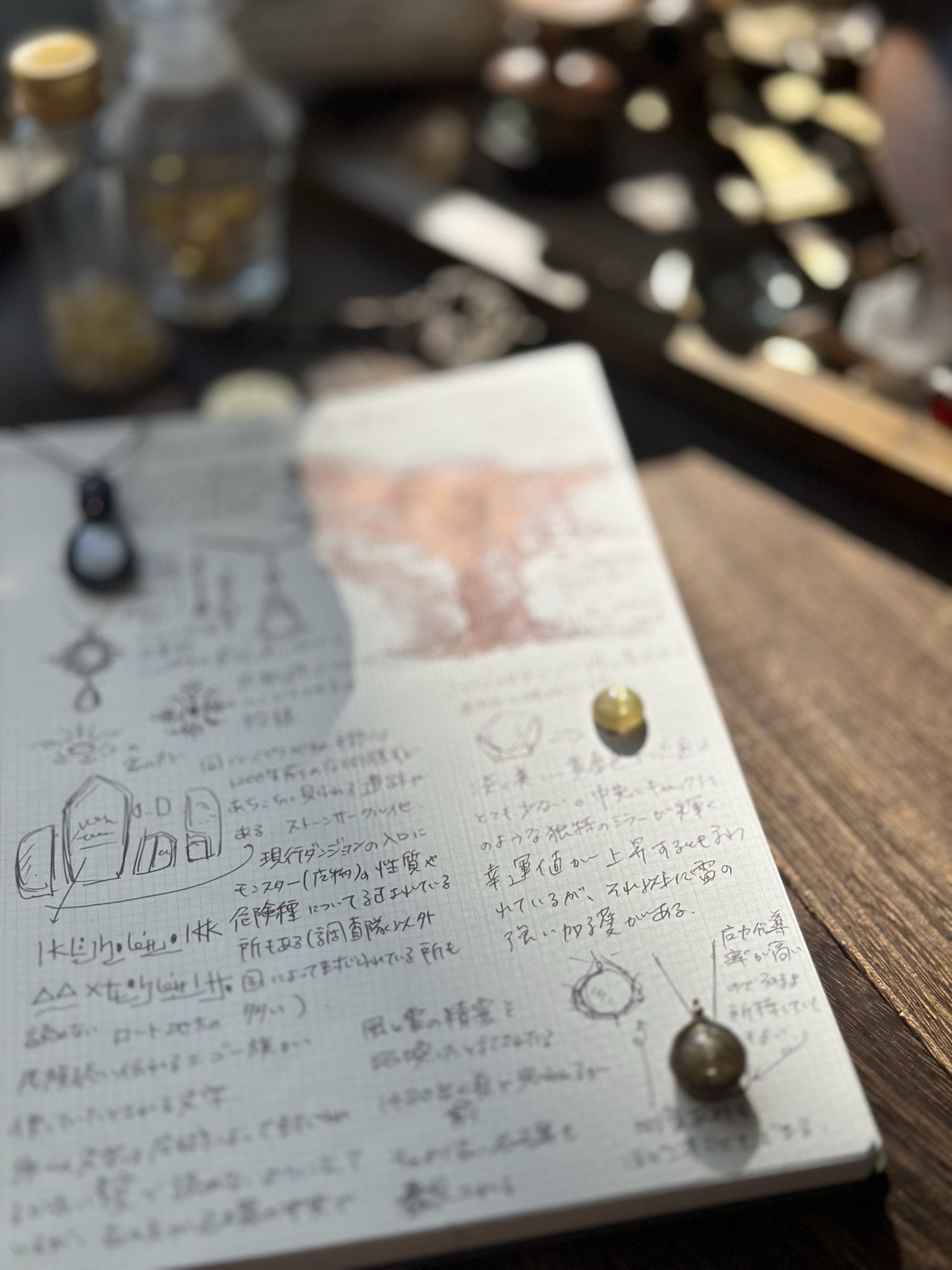 そうですね。どういう世界観で、どういう人が、どういう時に、どんな風に手に取ってくれるお店だったらいいかなっていうところをまず考えて。で、そしたらこういう設定だったら面白いかなっていうのを、まず大体の枠組みを作っておいて、忘れないように書いて。そこを起点にして石を仕入れたり、作品を作ったりっていう流れにすることがあります。逆に、来てくださるお客様をまずイメージをきちっとしておいて、このお客様どんなものをだったら身に着けたいと思ってくれるかなとか、どういう時にだったら身に着けられるだろうかっていうのをいろんな方向から考えて作ることもあります。