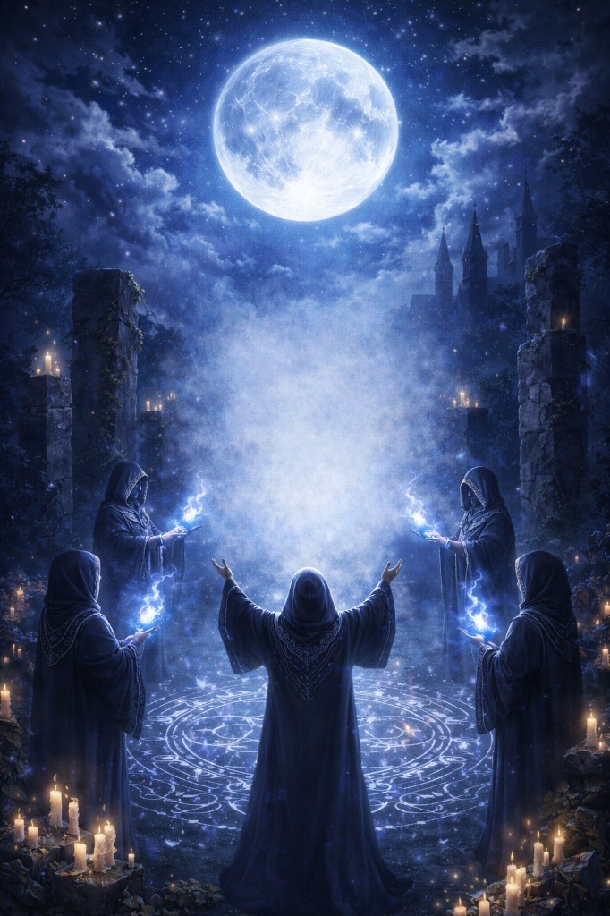 魔道士たちは力強くうなずくと、両手を月に向かって掲げ、何かを口ずさみ始めました。