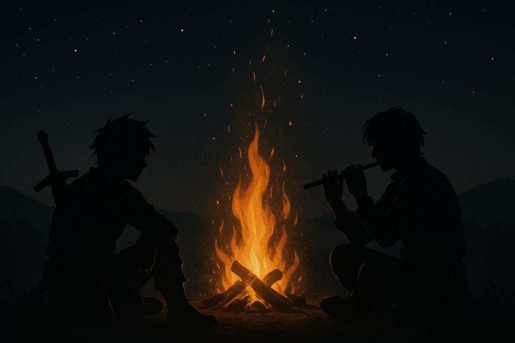 ある村での夜。ふたりは焚火を囲んで話し込んでいました。